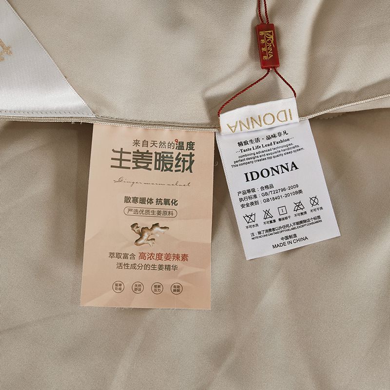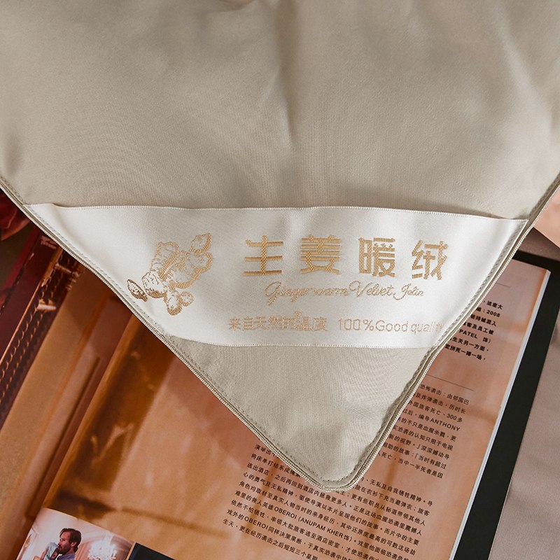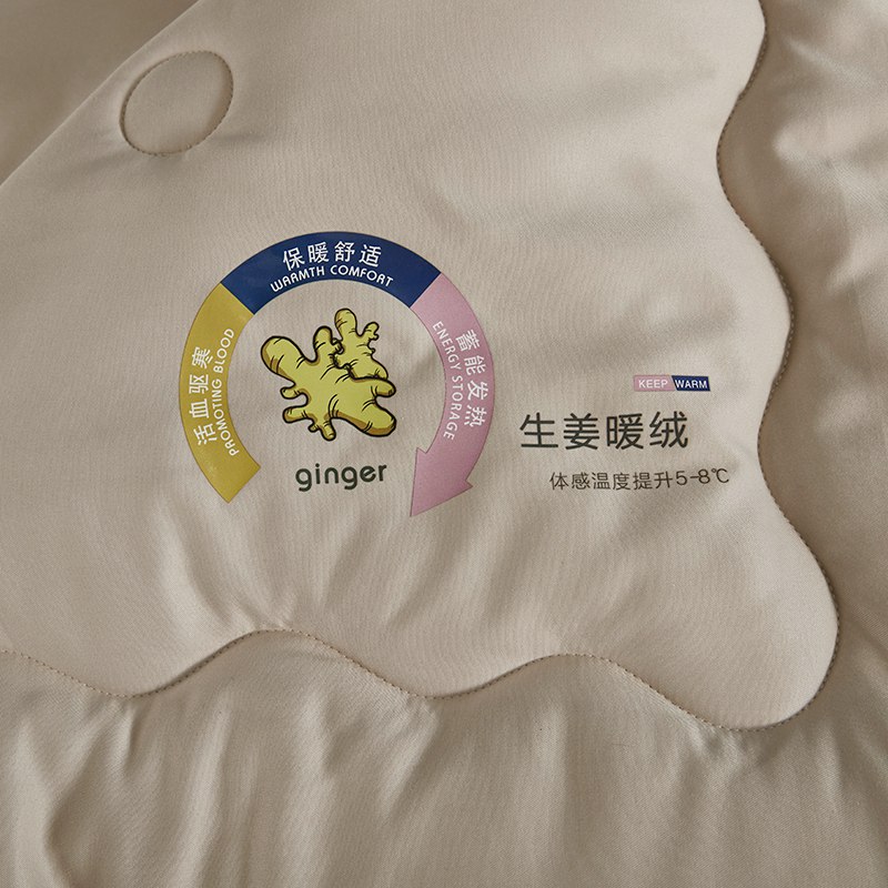 产品面料:面料:生姜暖绒+生姜精华(100%聚酯纤维) 填充物: 3A云绒纤维(100%聚酯纤维)