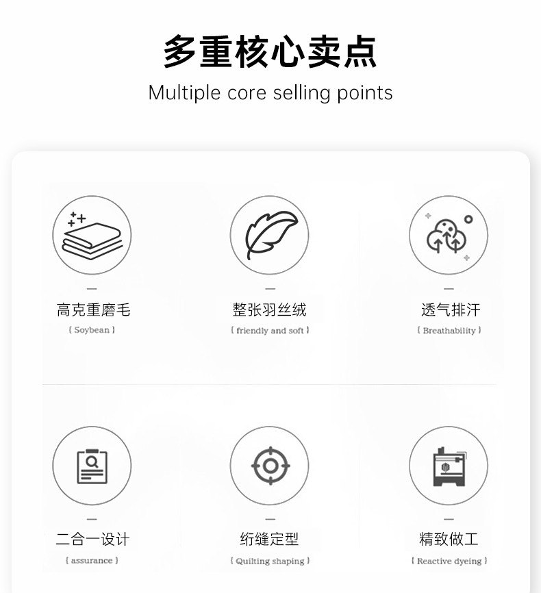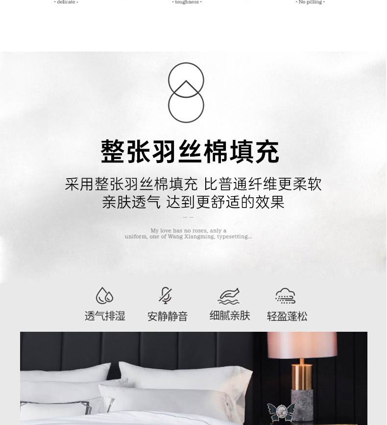 产品面料:高密磨毛(100%聚酯纤维) 填充物: 羽丝绒(100%聚酯纤维)