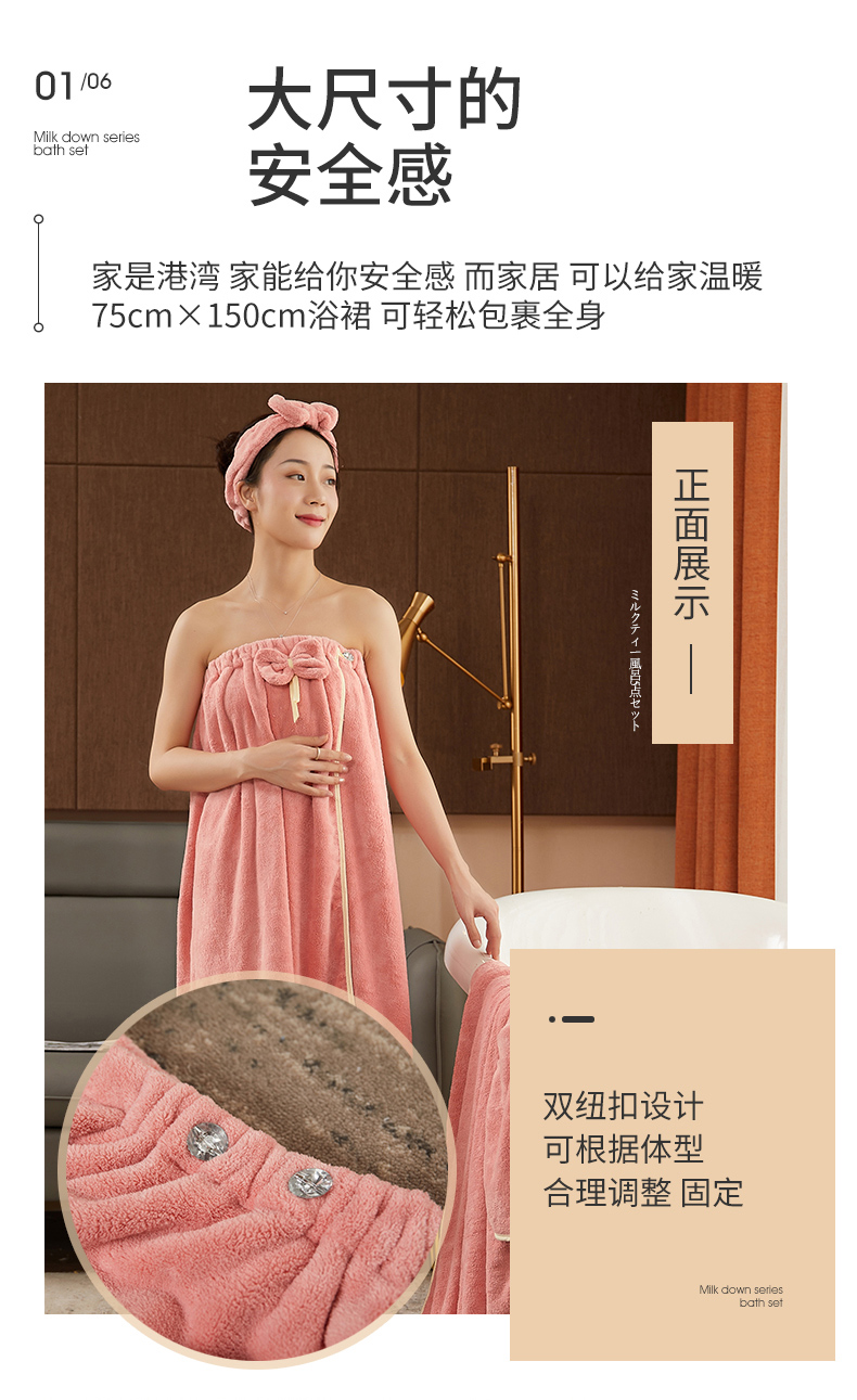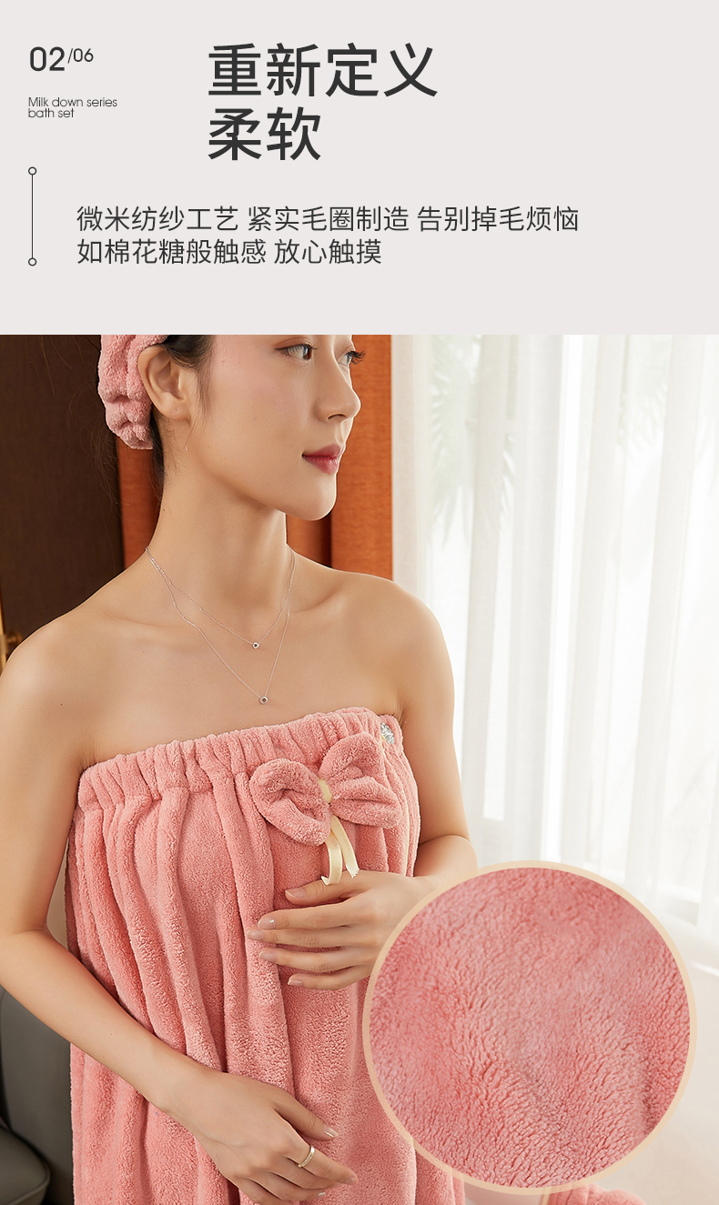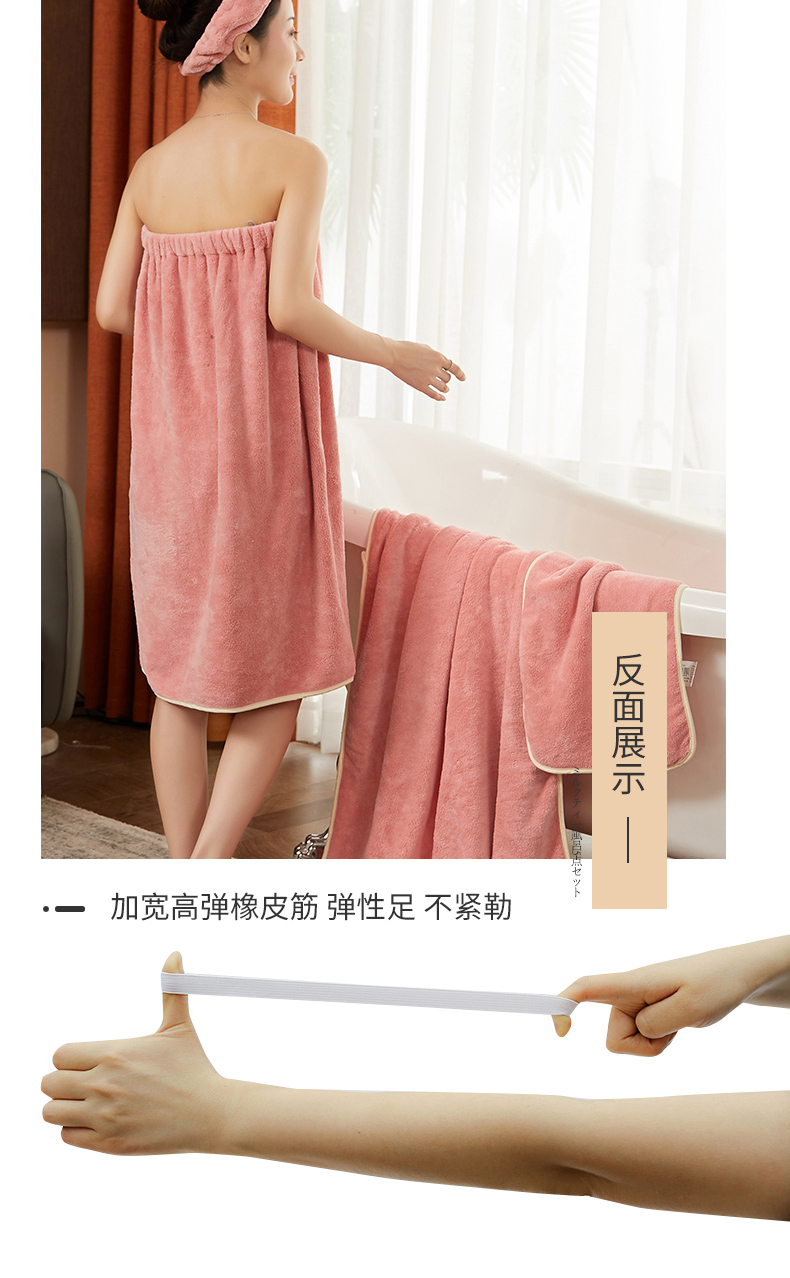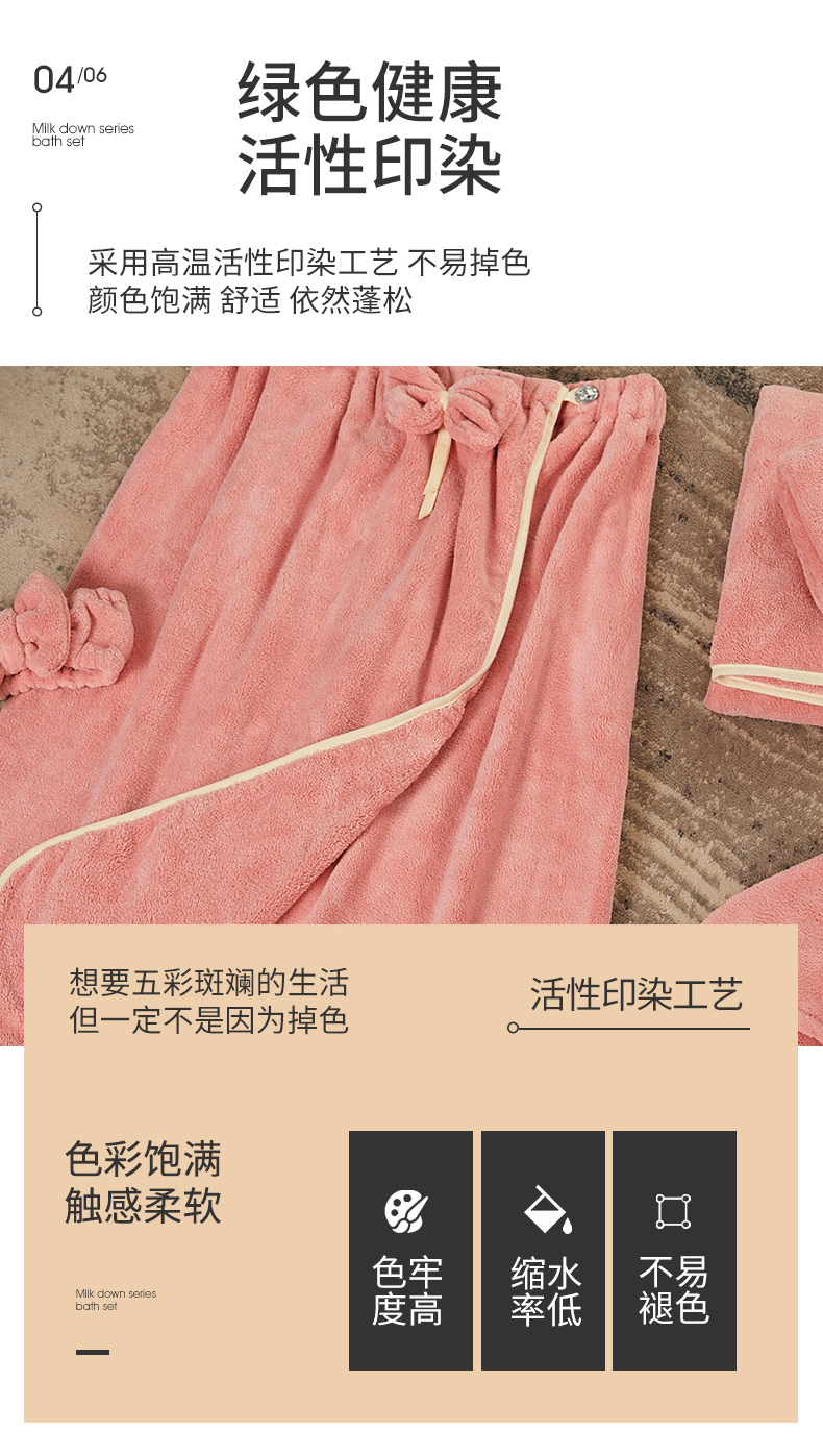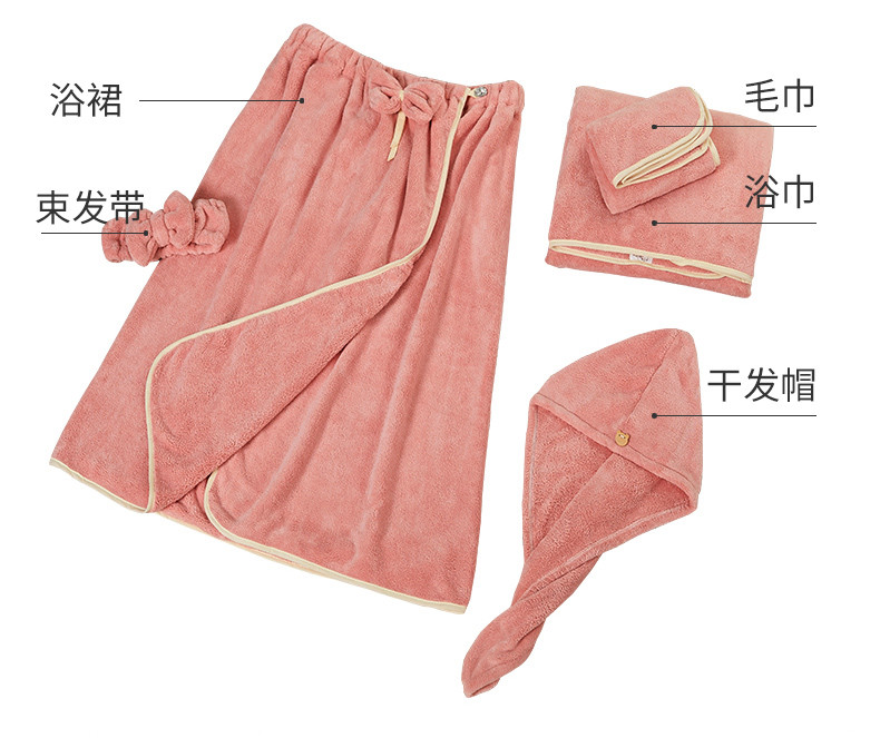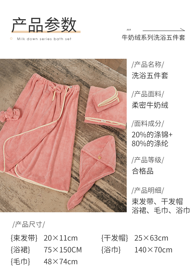 产品规格:束发带11*20cm /毛巾 48*74cm/干发帽 25*63cm/浴巾70*140cm /浴裙 75*150cm