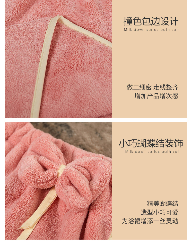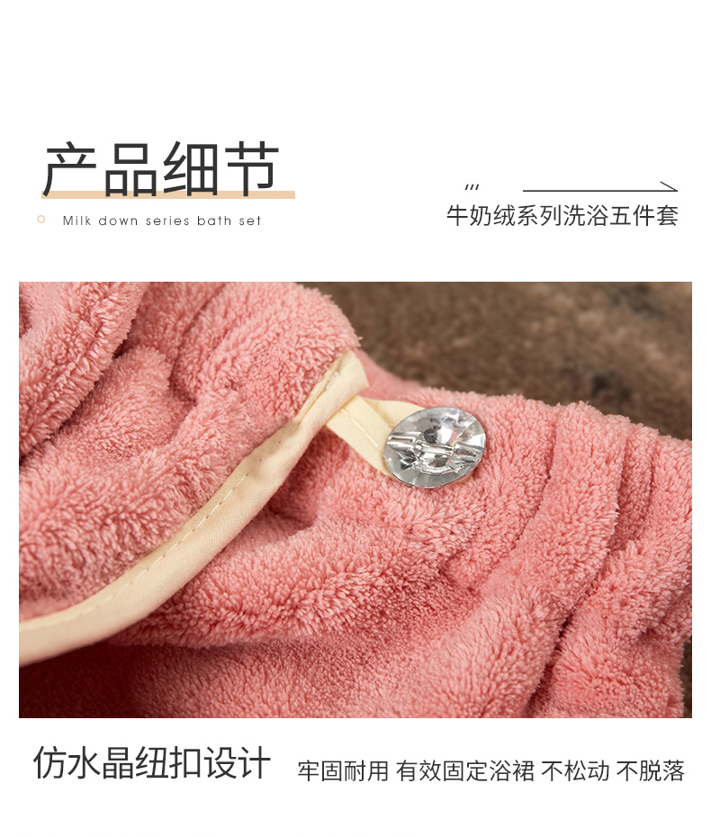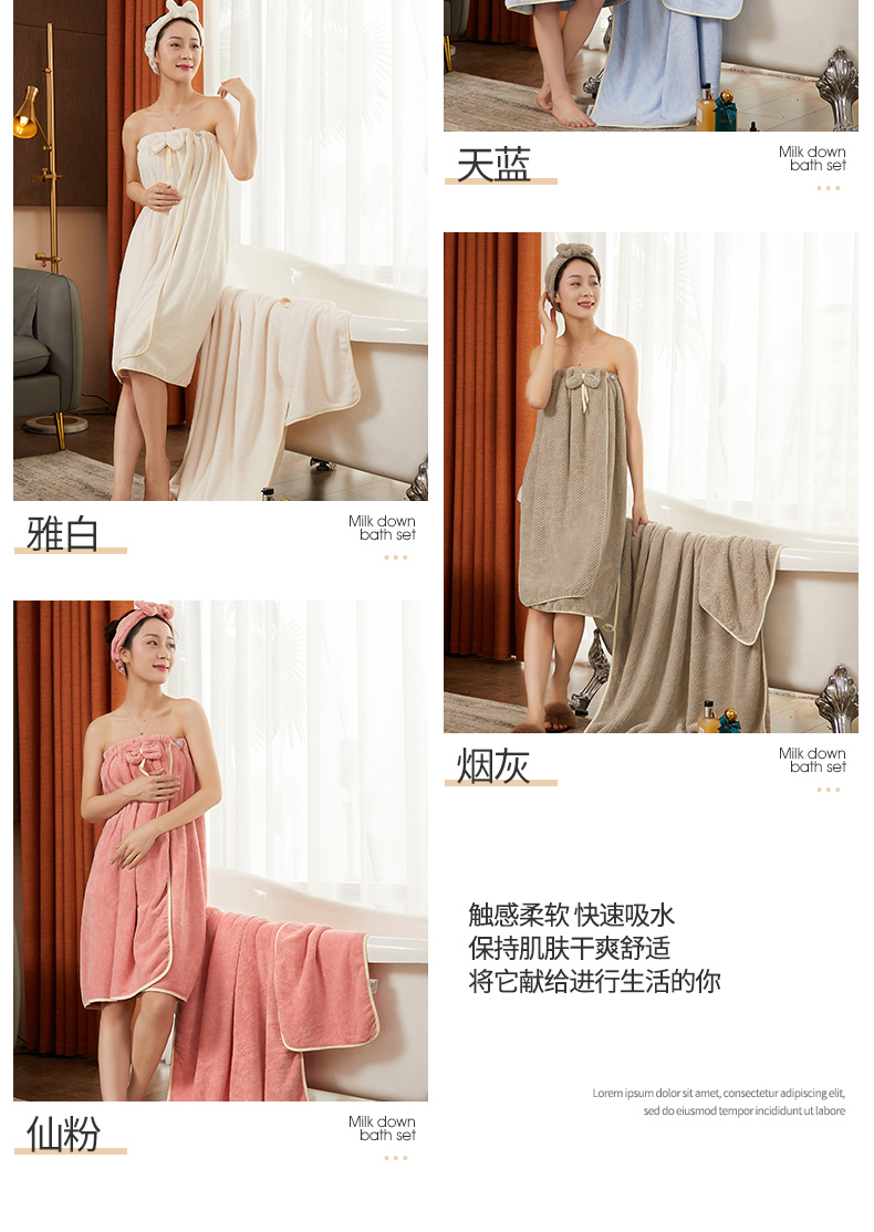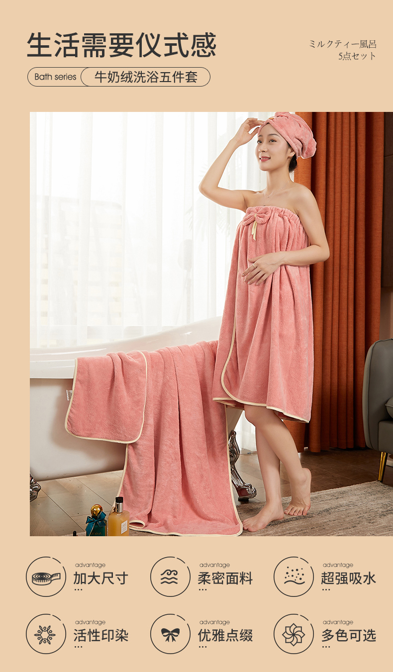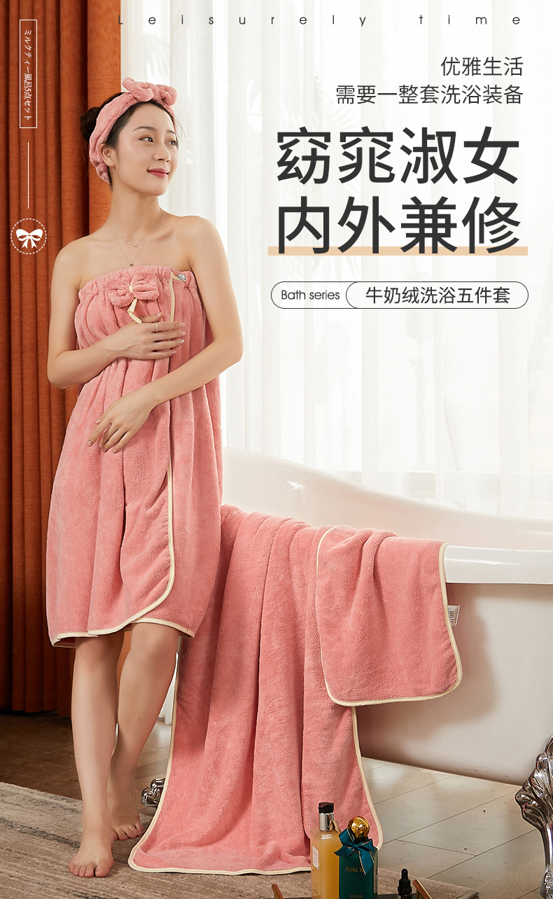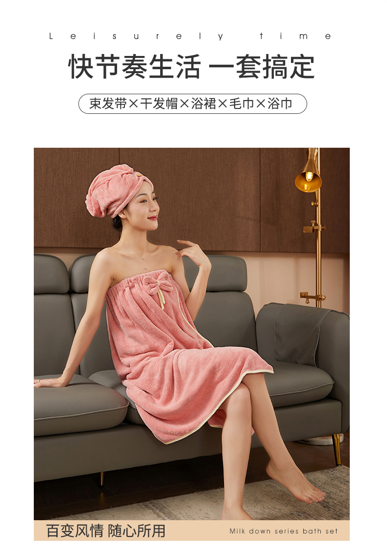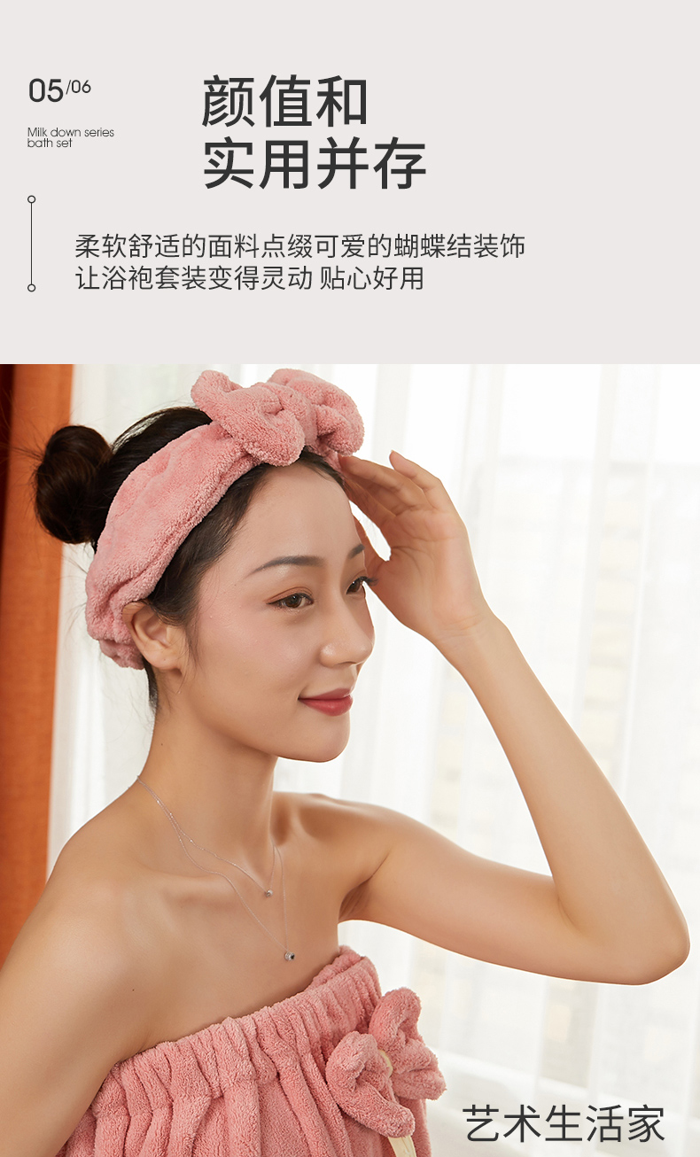产品规格:束发带11*20cm /毛巾 48*74cm/干发帽 25*63cm/浴巾70*140cm /浴裙 75*150cm